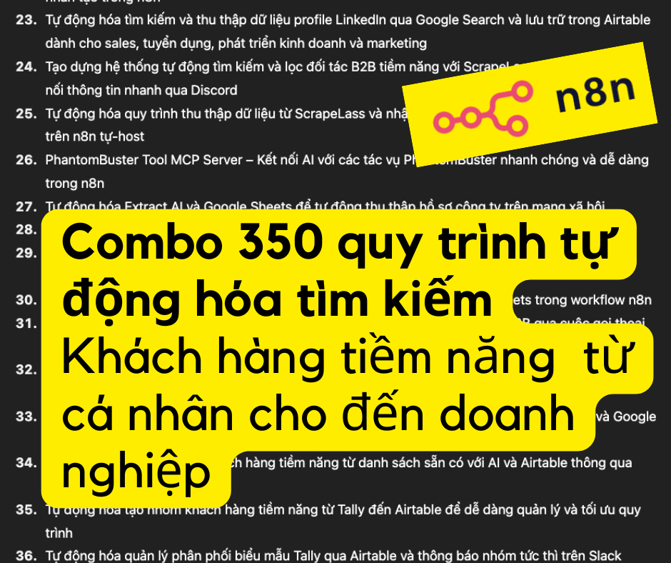 Bách đã tổng hợp được hơn 350 workflow - quy trình tự động hóa (tổng trị giá phải lên đến hơn $1000) dành riêng cho công việc Tìm kiếm khách hàng tiềm năng (Leads Generation). Những workflow này có thể dùng ngay trên n8n và chạy ngay được sau vài bước cấu hình căn bản.